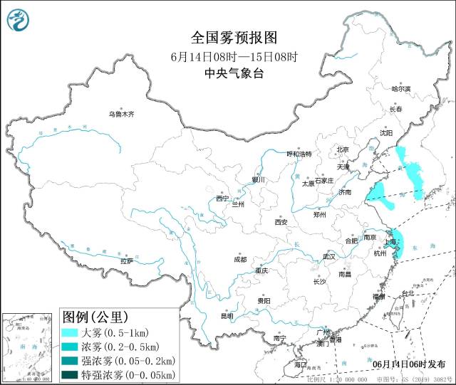 中央气象台6月14日06时继续发布大雾黄色预警: