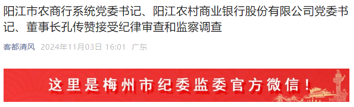 阳江市农商行系统党委书记、阳江农村商业银行股份有限公司党委书记、董事长孔传赞接受纪律审查和监察调查 2024-11-03 17:24 客都清风 0 阳江市农商行系统党委书记、阳江农村商业银行股份有限公司党委书记、董事长孔传赞涉嫌严重违纪违法,目前正接受广东省纪委监委驻省农信联社纪检监察组纪律审查和梅州市监委监察调查。 编辑:黄炜明 审核:张柯