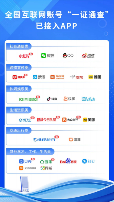 记者12月1日从工业和信息化部获悉,“一证通查”查询名下互联网账号服务新增接入今日头条、携程旅行、拼多多、饿了么、爱奇艺、小红书、大众点评、贝壳找房、链家等9款互联网APP,用户本人名下手机号码关联互联网账号的可查范围扩增至25款。