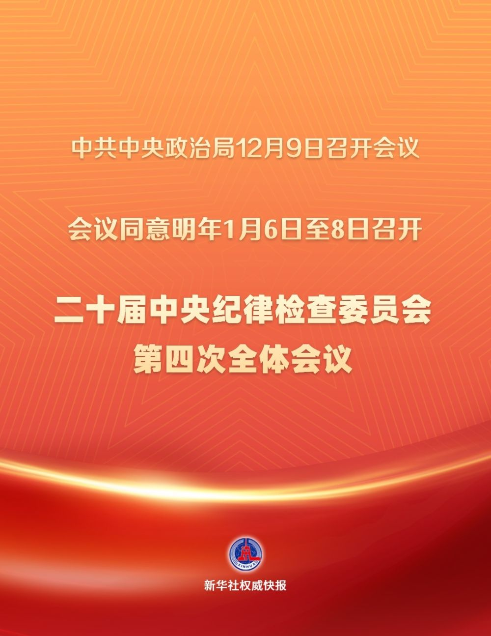 二十届中央纪委四次全会将于2025年1月6日至8日召开 2024-12-09 15:35 新华社 0 中共中央政治局12月9日召开会议 会议同意明年1月6日至8日召开二十届中央纪律检查委员会第四次全体会议 新华社记者:黄玥、王明玉 编辑:罗欢欢