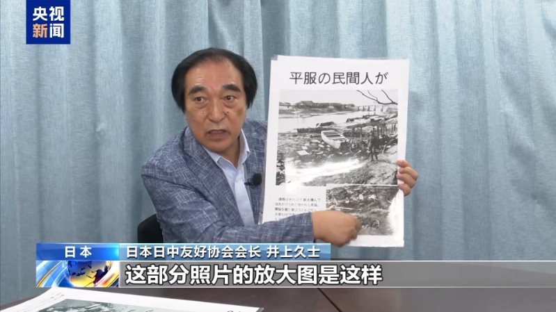 日本日中友好协会会长 井上久士:这里有一艘小船,这部分照片的放大图是这样,在一次集体屠杀之后,日本军队使用汽油和重油来焚烧尸体,这部分的尸体已经被烧焦,变成了黑色。这是一张惨绝人寰的照片。