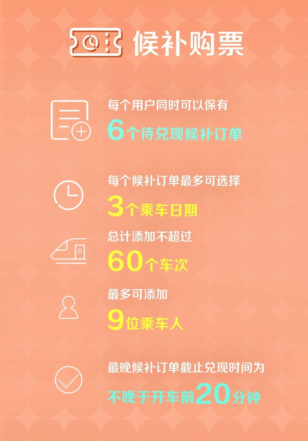 每个用户可以有6个待兑现候补订单,每个候补订单最多可选择3个乘车日期,总计添加不超过60个车次。