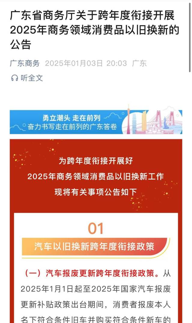 同时,汽车置换更新跨年度衔接政策,从2025年1月1日起至2025年国家汽车置换更新补贴政策出台期间,广东省汽车置换更新补贴活动按2024年汽车置换更新政策执行。