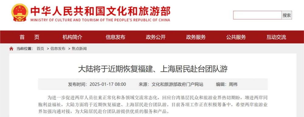 17日从文化和旅游部获悉,为进一步促进两岸人员往来正常化和各领域交流常态化,回应台湾基层民众和旅游业界热切期盼,增进两岸同胞利益福祉,大陆方面将于近期恢复福建、上海居民赴台团队游。