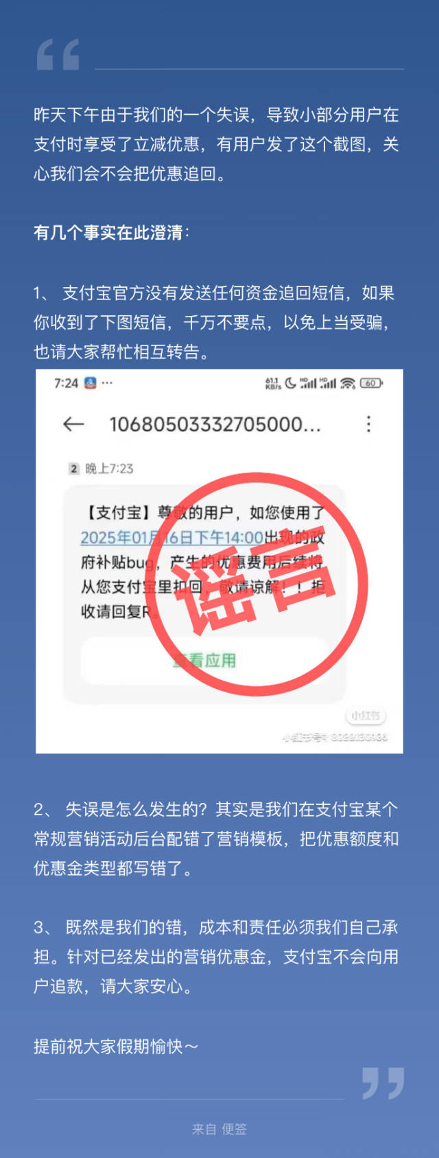 支付宝回应“打8折事故”:不会向用户追款 2025-01-17 09:24 支付宝 0 支付宝官方微博深夜发文称,由于一个失误,导致小部分用户在支付时享受了立减优惠,有几个事实在此澄清。全文如下: 编辑:林佳如(实习) 李舒宇 审核:蔡颜颜