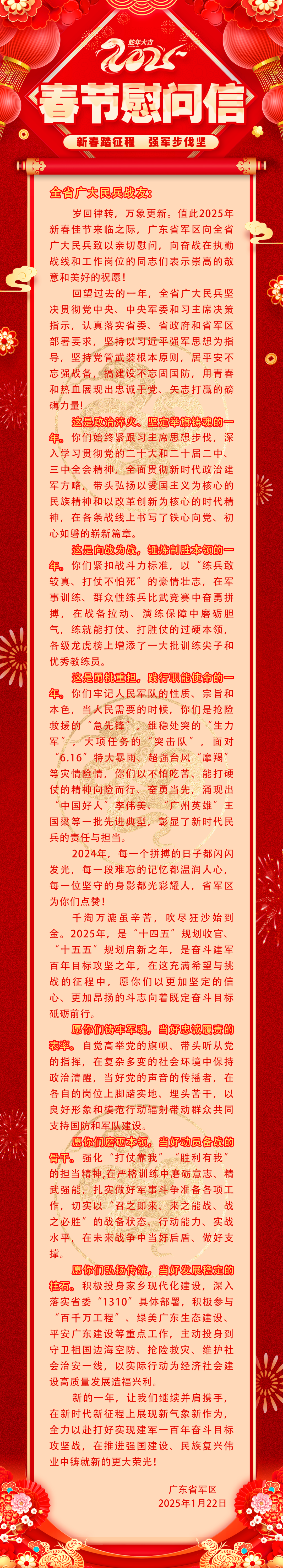 转发 | 致全省广大民兵的春节慰问信 2025-01-22 11:42 0 近日,广东省军区向全省民兵发送《致全省广大民兵的春节慰问信》,现予转发。春蛇献瑞,欢乐吉祥!提前祝大家春节愉快、阖家幸福、福暖四季、顺遂安康! 梅州军分区 编辑:罗欢欢 审核:蔡颜颜