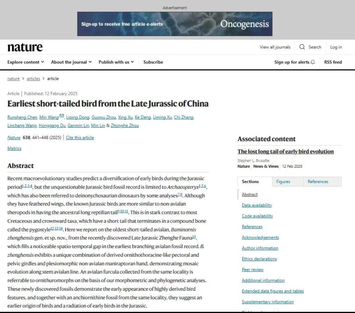 今天(13日),中国科学院古脊椎动物与古人类研究所与福建省地质调查研究院联合发布最新研究成果:通过对福建省政和动物群发现的侏罗纪鸟类化石的研究,发现全球最古老的鸟类之一——“政和八闽鸟”,也是迄今唯一确切的侏罗纪鸟类,揭示了现代鸟类的体型结构在侏罗纪晚期(距今1.5亿年)就已经出现,该研究将以尾综骨为代表的鸟类重要特征出现的时间提早了近2000万年。相关研究成果北京时间2月13日在《自然》发表。
