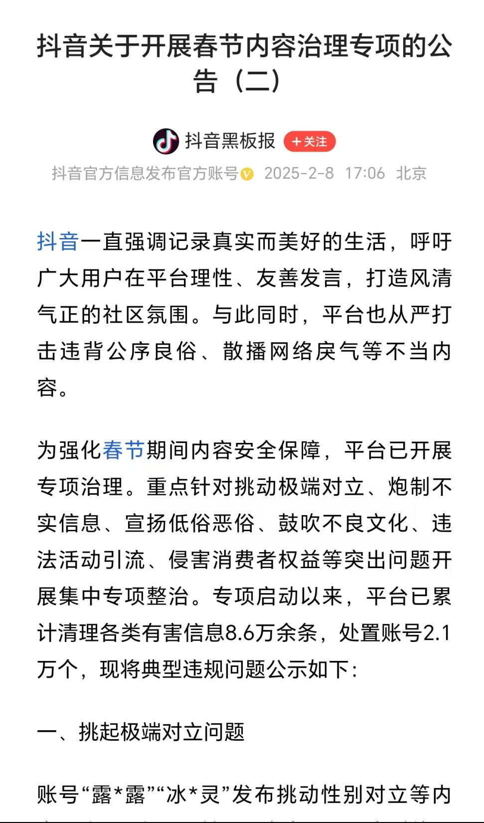 “清朗·2025年春节网络环境整治”专项行动启动以来,网信部门迅速部署、狠抓落实,强化排查处置,抓好督导整改,督促重点网站平台切实履行主体责任,针对挑起极端对立、炮制不实信息、宣扬低俗恶俗、鼓吹不良文化、违法活动引流、侵害消费者权益等6类问题,从严查处一批违法违规典型案例,确保整治工作取得扎实成效,为营造春节良好网络氛围提供了有力保障。