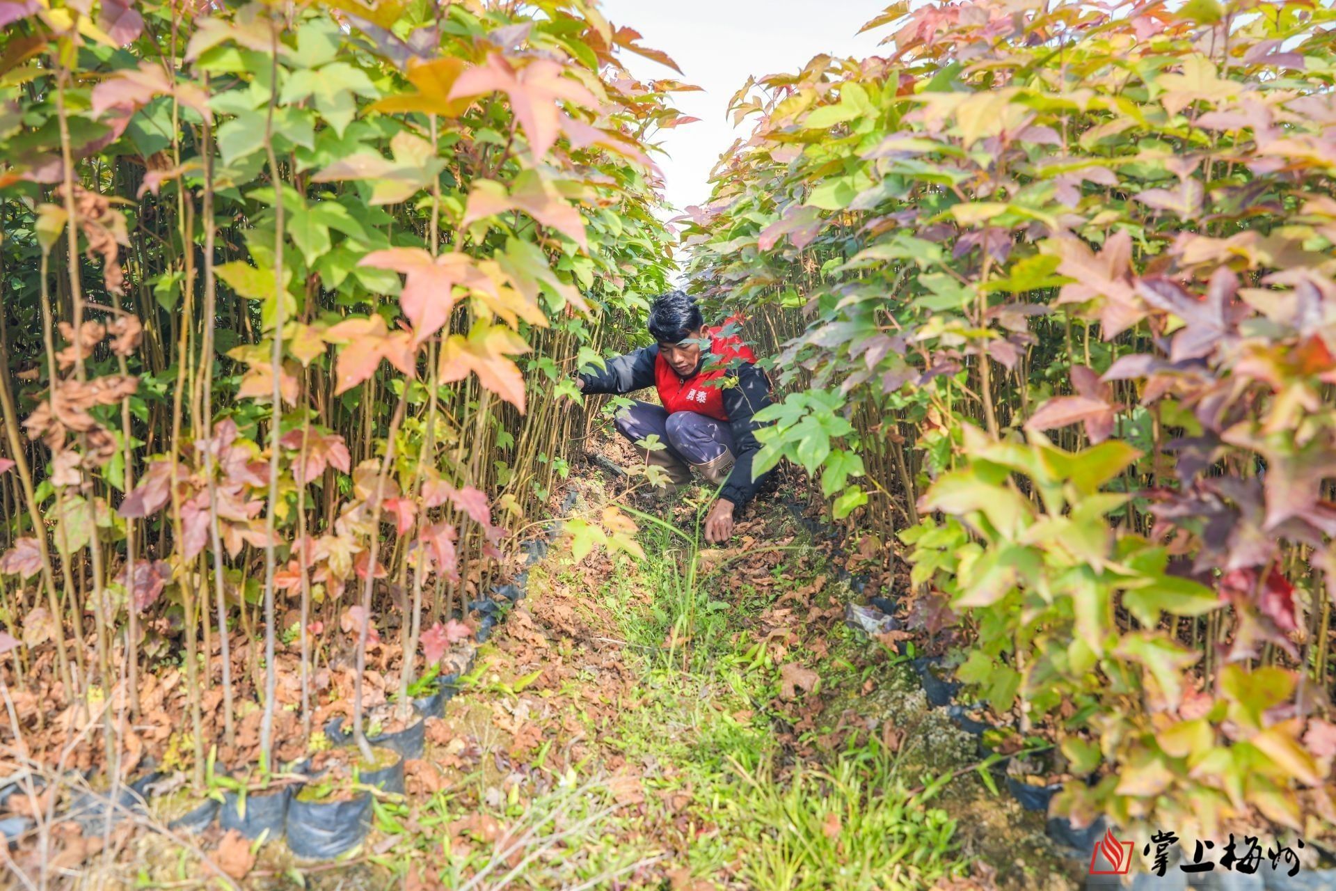 梅江区长沙镇下罗村,农户们抢抓晴好天气对苗木进行施肥、除草等日常养护工作,为造林季做足准备。(吴腾江 摄)