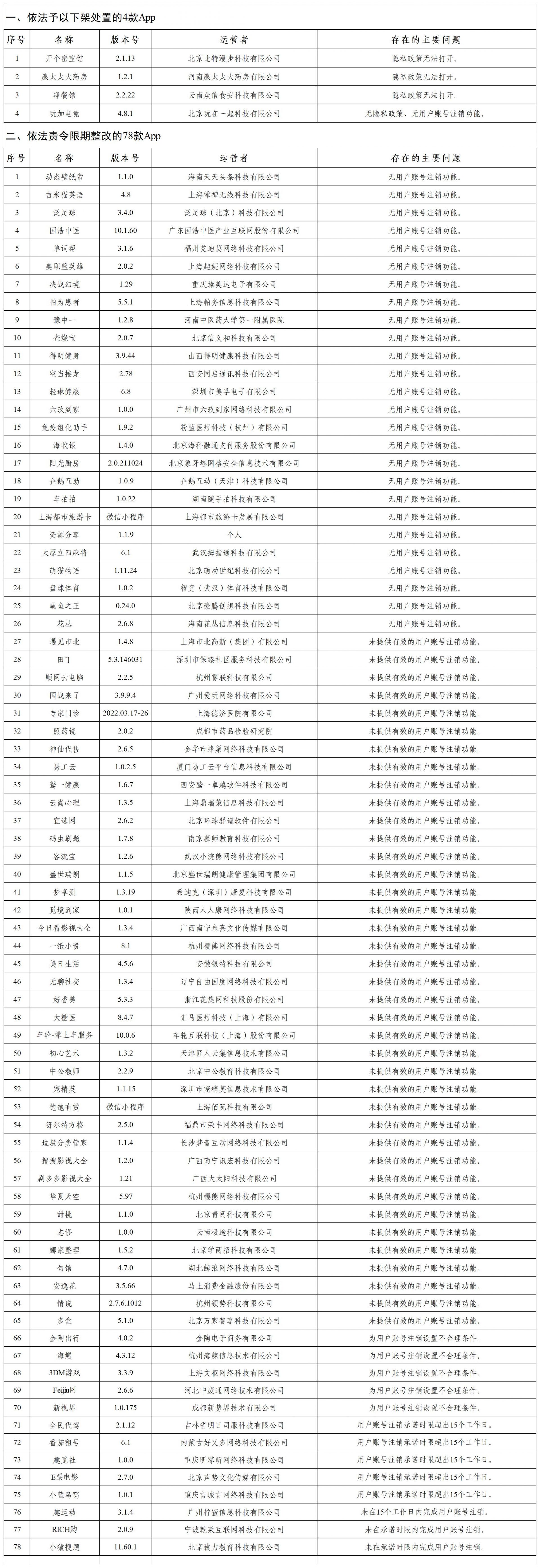“动态壁纸帝”等78款App存在未按法律规定提供删除或更正个人信息功能问题,违反《个人信息保护法》等法律法规,依法依规责令限期1个月完成整改,逾期未完成整改的,依法依规予以下架处置。