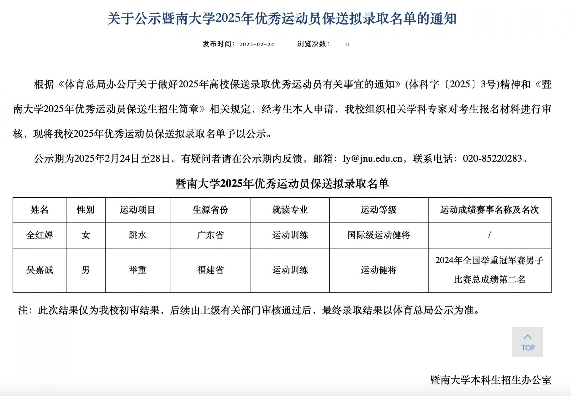 2月24日,暨南大学招生网发布的《2025年优秀运动员保送拟录取名单的通知》显示,全红婵进入拟录取名单。