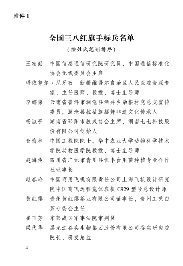 为表彰先进、树立榜样,激励广大妇女自尊自信、自立自强,奋进新征程、建功新时代,积极投身中国式现代化建设,全国妇联决定,授予王志勤等10人全国三八红旗手标兵称号,授予张晓欢等596人全国三八红旗手称号,授予首都医科大学附属北京妇产医院北京妇幼保健院等395个单位全国三八红旗集体称号,授予北京市城建园林金都公司绿化三大队天安门广场特养班组等599个单位全国巾帼文明岗称号。