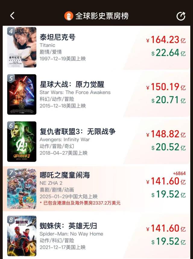 《哪吒2》跃升至全球影史票房榜第7位! 2025-03-01 08:10 南方+ 0 据灯塔专业版数据,电影《哪吒之魔童闹海》上映32天,累计全球票房(含预售)超141.6亿元,超越《蜘蛛侠:英雄无归》,跃升至全球影史票房榜第7位。其中海外票房已突破1.5亿元。 编辑:李子莹 审核:练海林