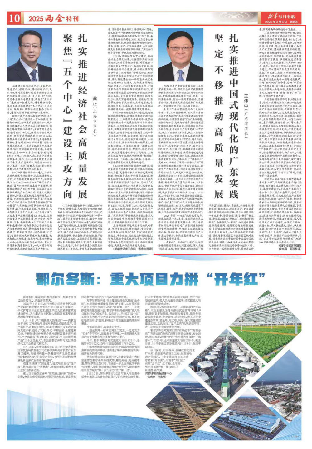 三是坚持实体经济为本、制造业当家,推动产业科技互促双强,加快建设更具国际竞争力的现代化产业体系。推动产业体系向新图强,巩固提升20个战略性产业集群,大力发展集成电路、新能源汽车、低空经济、商业航天、新材料、生物医药等新兴产业,培育生物制造、量子科技、具身智能、6G等未来产业,特别是围绕人工智能和机器人两大领域集中发力、抢占先机,打造发展新质生产力的重要阵地。加快传统产业改造升级,今年再推动5500家企业“小升规”、超1万家工业企业开展技术改造和数字化转型。加快构建全过程创新链,深入开展基础研究“卓粤”计划和“广东强芯”、核心软件攻关等重大专项,推进科技成果转化和产业化,打造具有全球影响力的产业科技创新中心。坚持和落实“两个毫不动摇”,深化国资国企改革,依法保护民营企业和民营企业家合法权益,支持民营企业投资重大基础设施、进入重大应用场景,实施优质企业梯度培育“十百千万”计划,打造世界一流企业群。