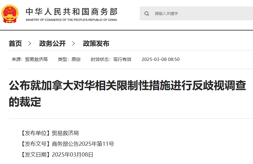 调查机关认定,加拿大相关被调查措施构成《中华人民共和国对外贸易法》第七条“在贸易方面对中国采取的歧视性的禁止、限制或者其他类似措施”,相关措施影响了正常贸易秩序,对中国造成严重负面影响。