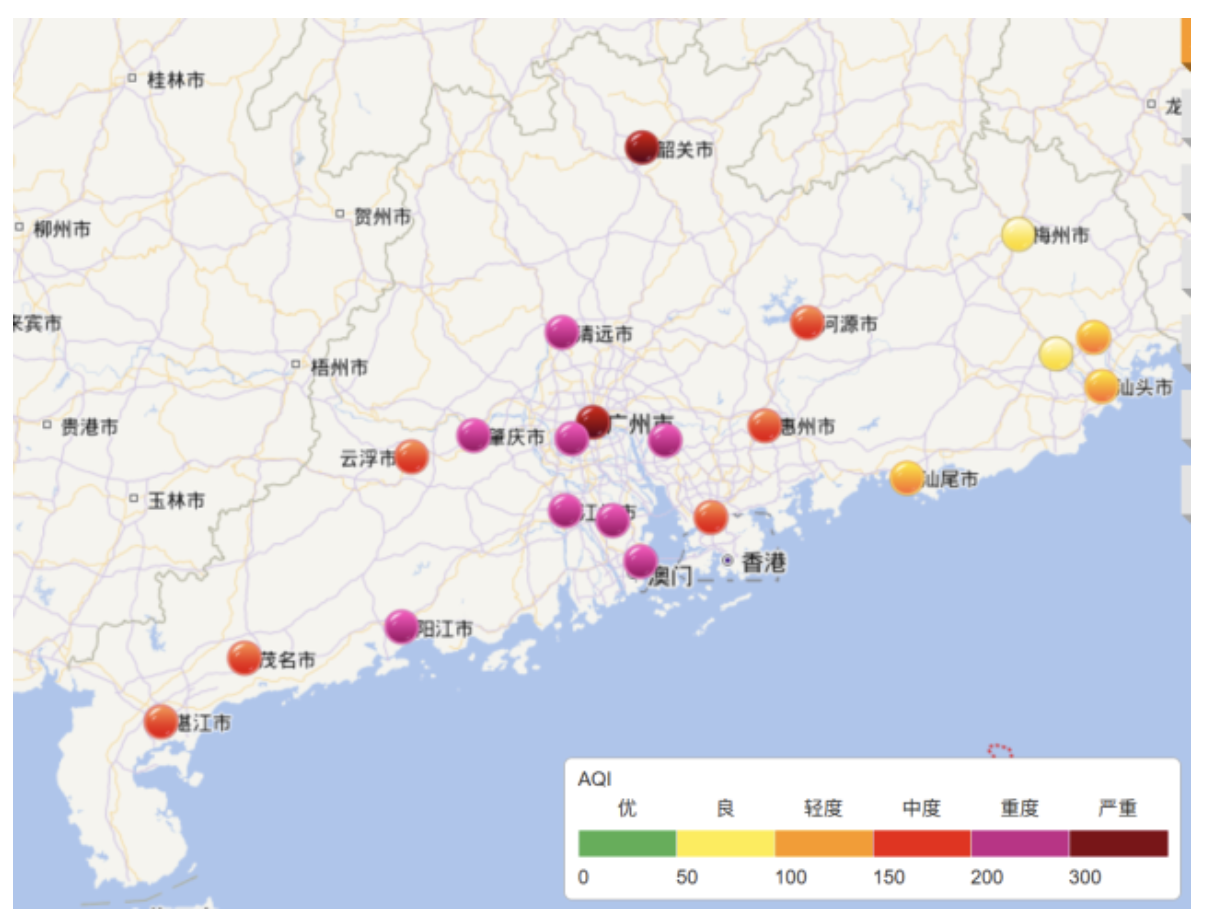 重度污染:肇庆、珠海、中山、东莞、阳江、清远、佛山、江门