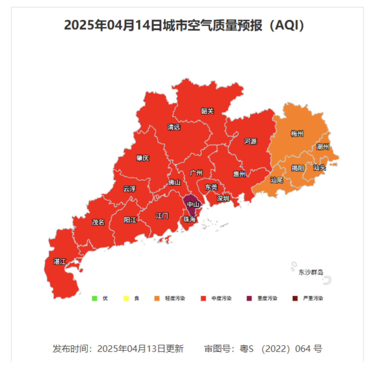粤东:4月14-20日,空气质量优至良为主,其中14-16日,受风场辐合和北方沙尘影响,大部分地市良至轻度污染。
