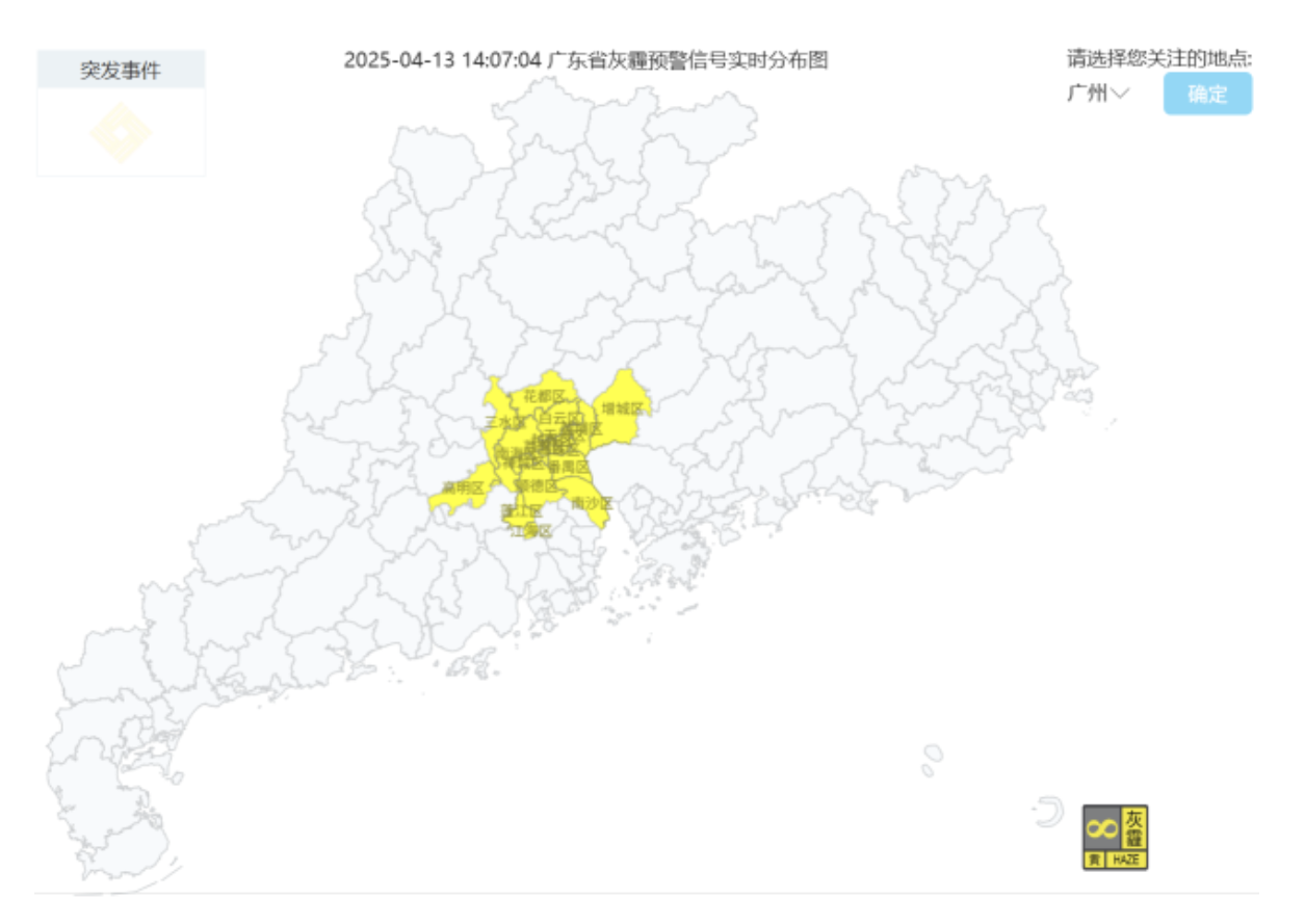 截至13日14时7分,广州、佛山、江门等地多个区已启动灰霾黄色预警。