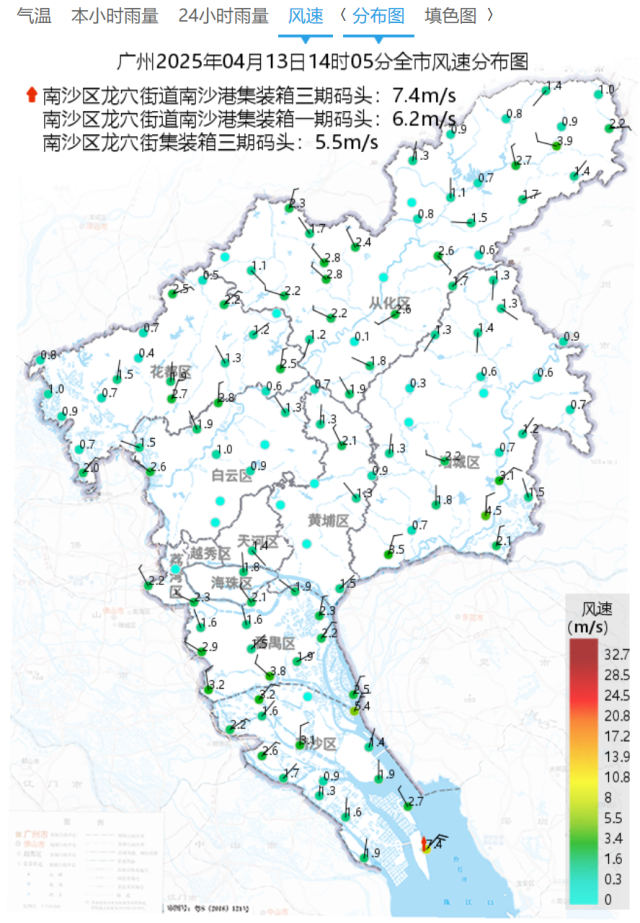 另一方面,广东的风也不大,以广州为例,截至13日14时,全市风力都比较小,无法吹散灰霾。