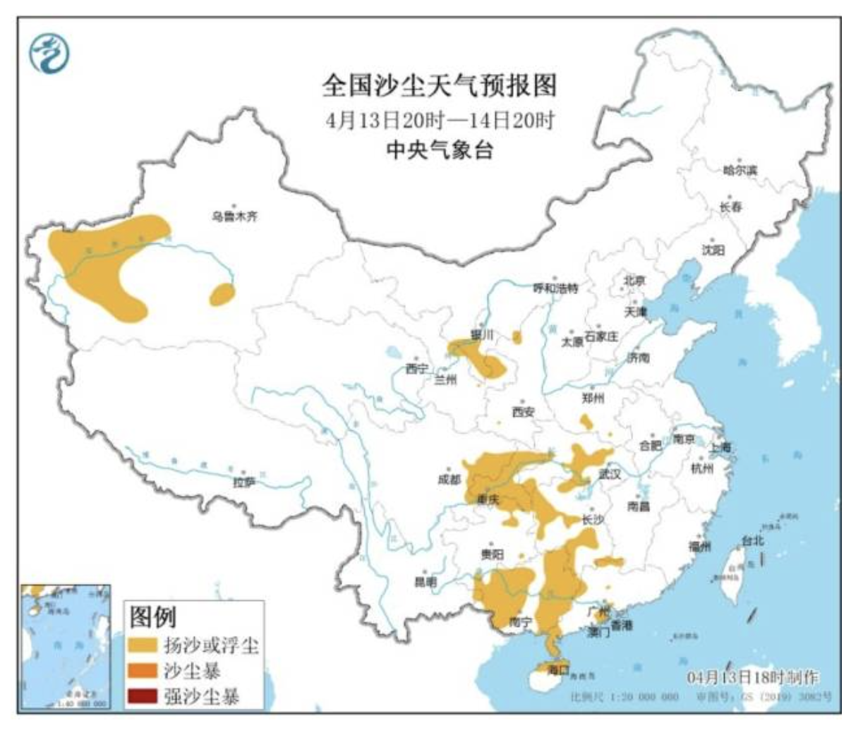 同时,在13日18时,中央气象台继续发布沙尘暴蓝色预警:预计4月13日20时-14日20时,广东西部等地的部分地区有扬沙或浮尘天气。