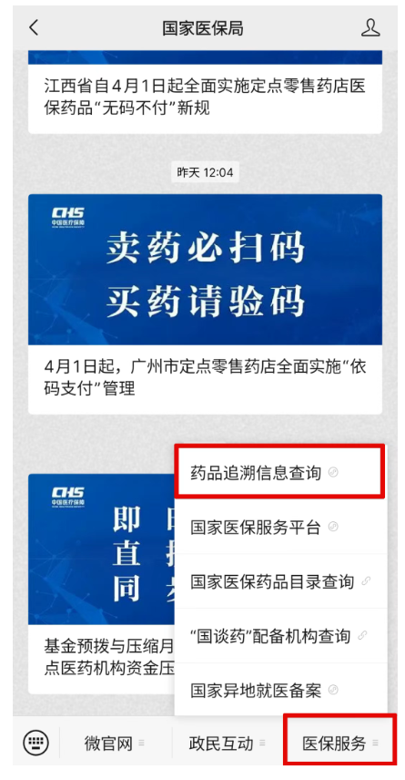 或进入“国家医保局”微信公众号消息对话页,点击医保服务→药品追溯信息查询,进入查询页面。
