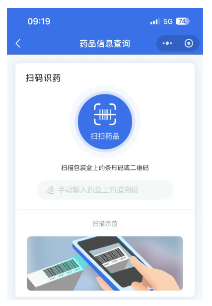 第二步:在“药品信息查询”页面,可扫描药品包装盒上的二维码或条形码进行查询。