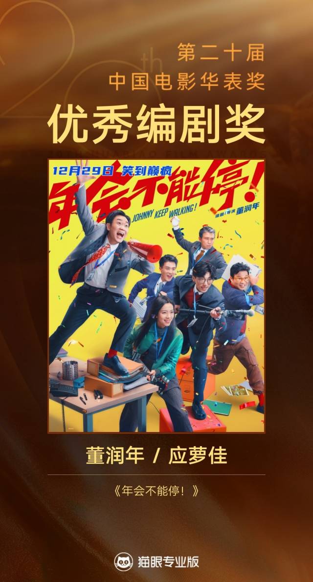 董润年、应萝佳凭借《年会不能停!》获得优秀编剧奖。该片于2023年12月29日上映,凭借喜剧元素和现实题材融合的剧情设置获得观众的广泛喜爱,最终累计票房达12.92亿元。在获得华表奖之前,《年会不能停!》曾获得第37届大众电影百花奖最佳编剧奖,并获第37届中国电影金鸡奖最佳编剧奖提名。