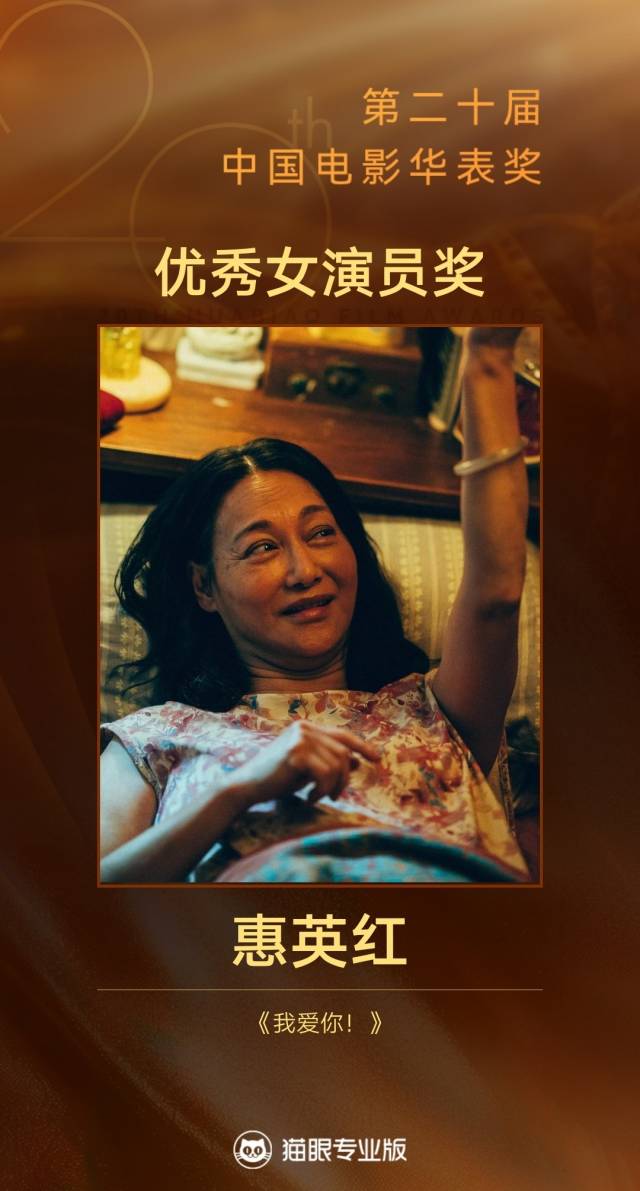 惠英红凭借《我爱你!》中的李慧如一角获得优秀女演员奖。此前她曾凭借该角色获得第36届中国电影金鸡奖最佳女主角提名。这是惠英红首次提名华表奖并获奖,也是香港女演员首次获得华表奖优秀女演员奖。