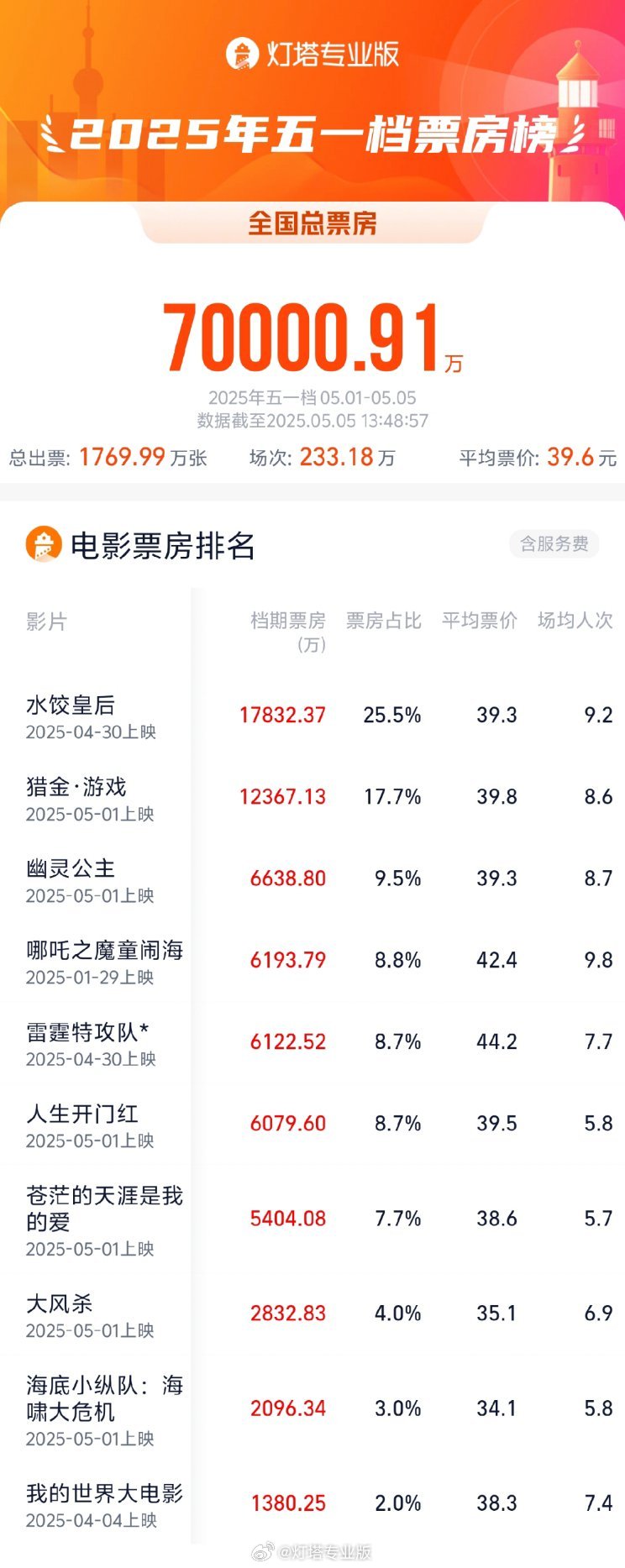 2025五一档电影票房破7亿 2025-05-05 15:48 人民日报 0 据灯塔专业版,截至5月5日13时48分,2025年五一档(5月1日-5月5日)档期内总票房突破7亿,影片《水饺皇后》《猎金·游戏》《幽灵公主》暂列前三名。 编辑:杨舒琳 审核:练海林