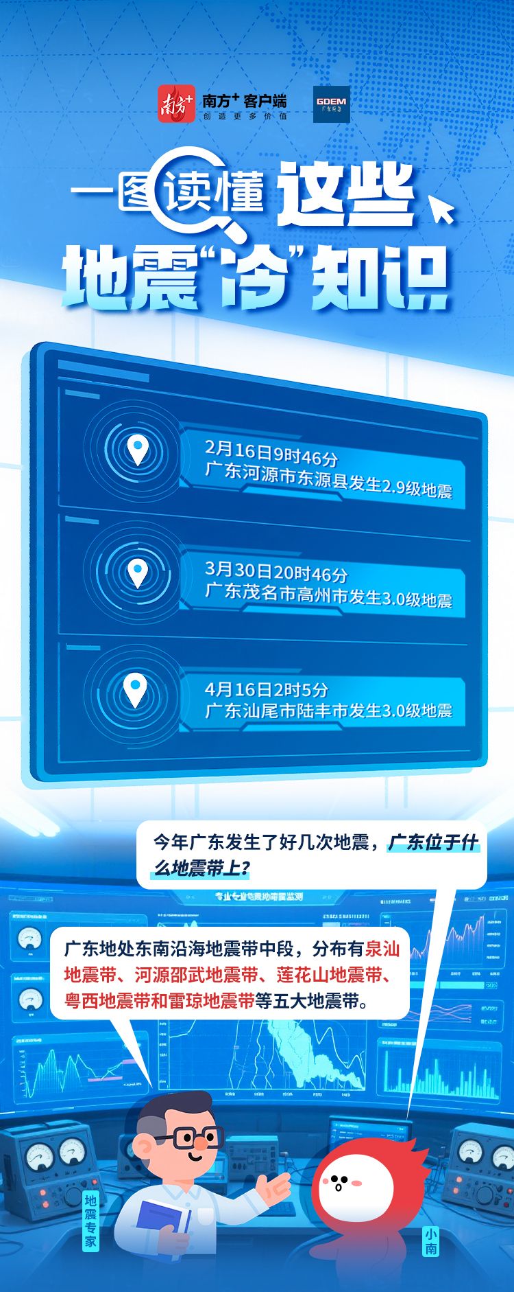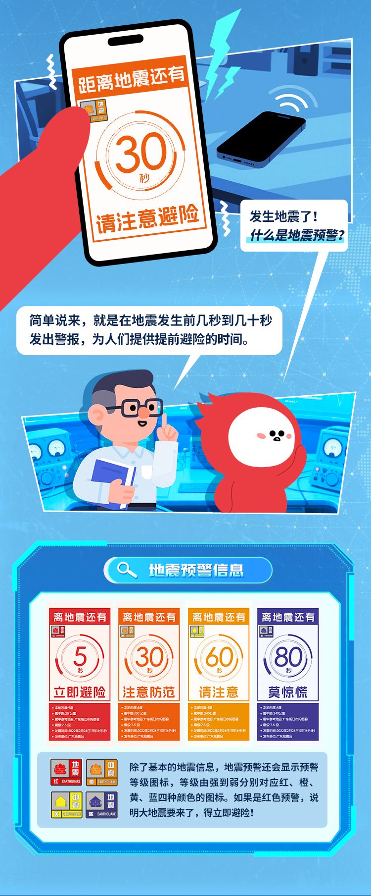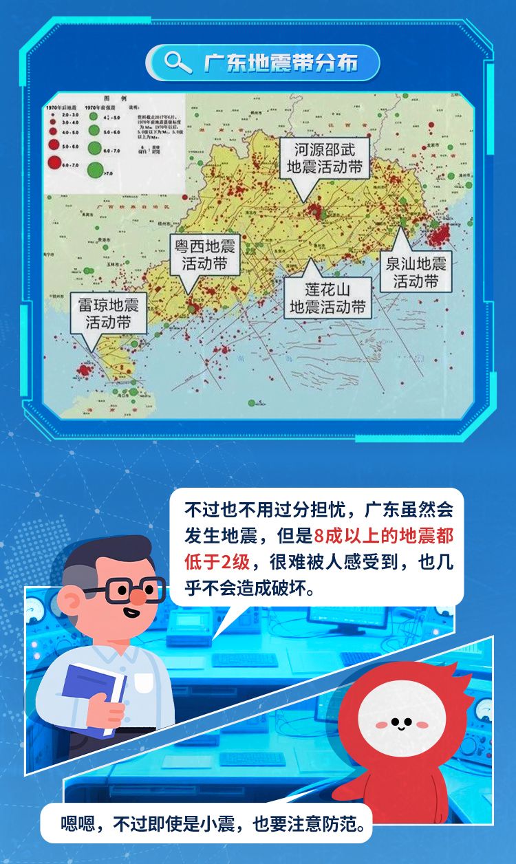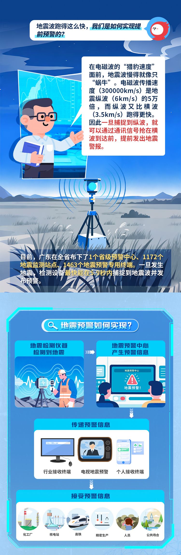 广东处在什么地震带上?如何在数秒内将地震预警精准发给终端用户?如何为重大工程进行地震“体检”,为其安全保驾护航?一图带你读懂这些地震“冷”知识️↓