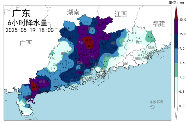 19日白天,湛江北部、茂名、阳江、清远、韶关、江门、佛山、广州、东莞、惠州、河源等的部分市县,出现了中到大雨局部暴雨。其中,湛江北部、茂名和阳江局部出现了大暴雨。