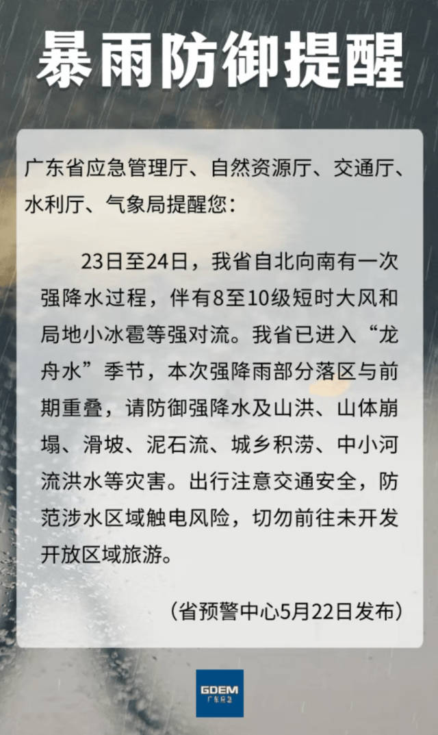 5月21日,广东正式进入“龙舟水”时期。气象部门预计,这一个月,广东将有5次区域性暴雨过程。5月22日,广东省应急管理厅、自然资源厅、交通厅、水利厅、气象局五部门联合发布暴雨预警,23日至24日,全省自北向南有一次强降水过程,伴有8至10级短时大风和局地小冰雹等强对流。