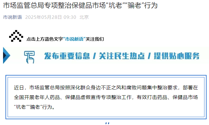 近日,市场监管总局按照深化群众身边不正之风和腐败问题集中整治要求,部署在全国开展老年人药品、保健品虚假宣传专项整治工作,有效打击药品、保健品市场“坑老”“骗老”行为。