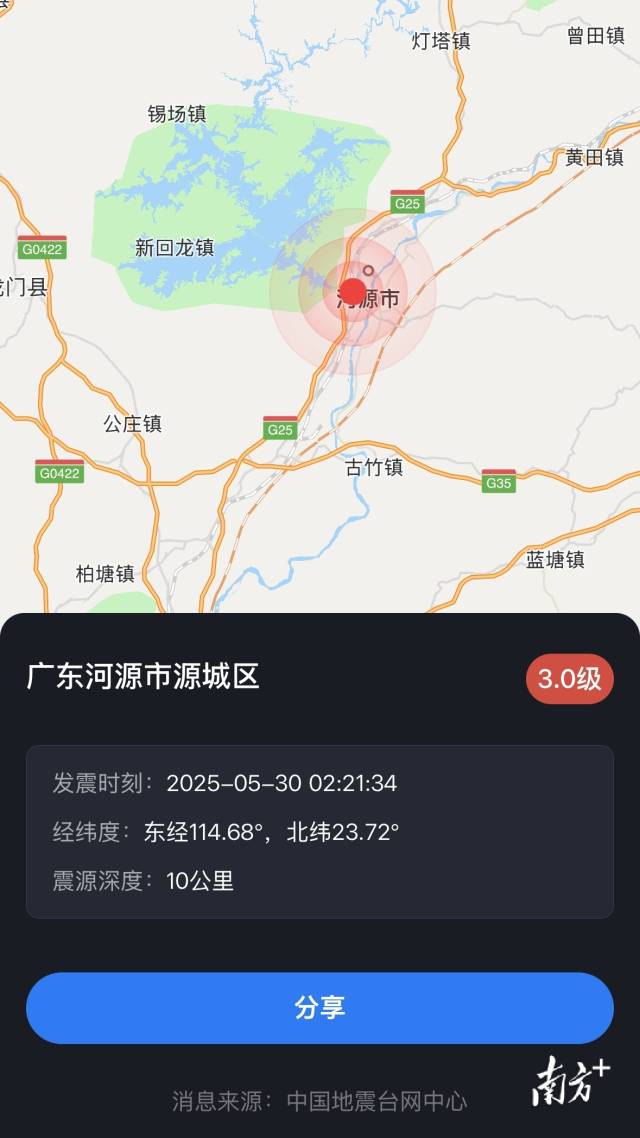 据中国地震台网测定,2025年5月30日2时21分在河源市源城区源南镇双下村附近(北纬23.72度,东经114.68度)发生3.0级地震,震源深度10千米,震中附近震感较为明显。 不少网友发帖表示有明显震感。