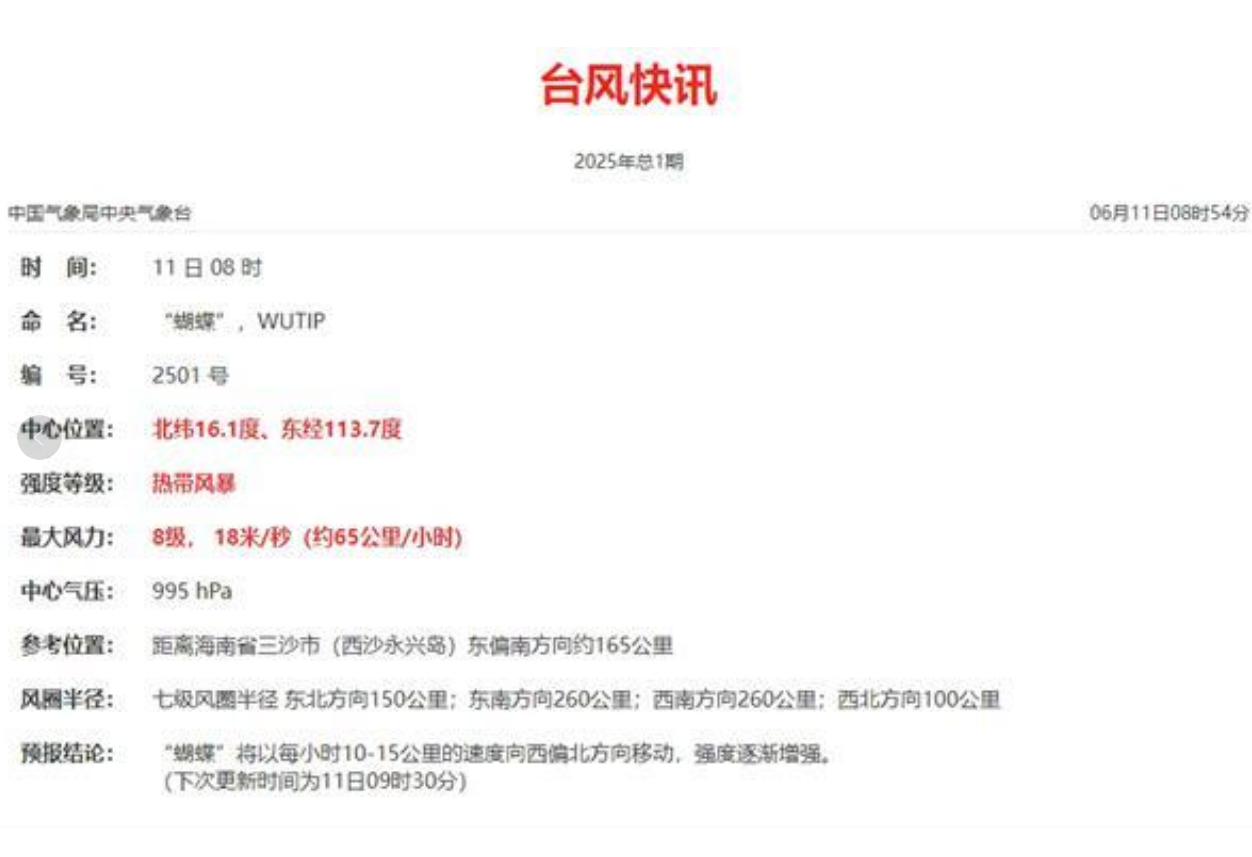 今天(6月11日)8时前后,南海热带低压增强为今年第1号台风“蝴蝶”(热带风暴级,英文名称:WUTIP;名字来源:中国澳门;名字意义:一种昆虫)。预计“蝴蝶”将于13日在海南岛南部到广东西部一带沿海登陆。