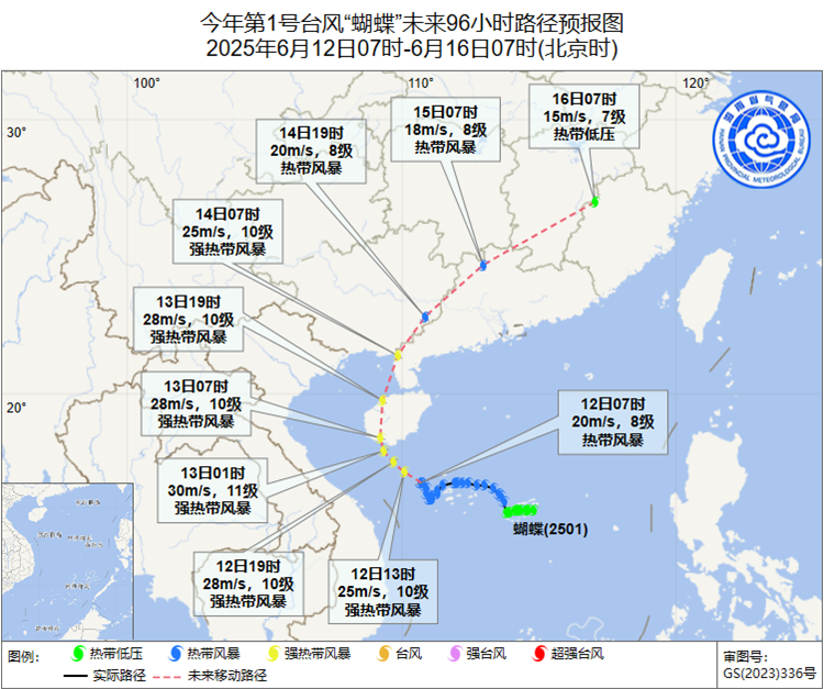 据中央气象台消息,今年第1号台风“蝴蝶”将以每小时10公里左右的速度向西北转偏北方向移动,可能于13日凌晨到上午在海南陵水至乐东一带沿海登陆,14日白天在广东西部到广西沿海再次登陆。