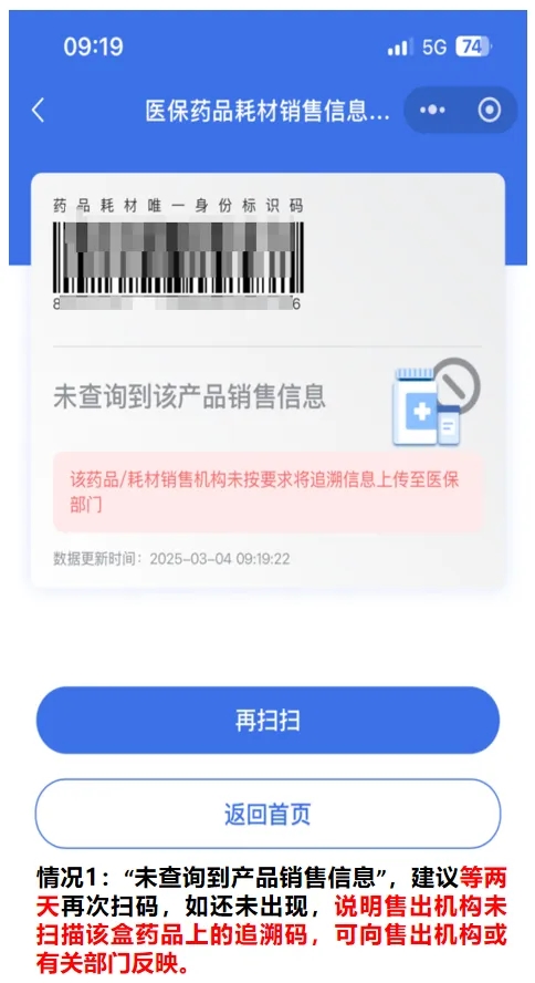 建议等两天再扫码,如还未出现,说明售出机构未扫描该盒药品上的追溯码,可向售出机构或有关部门反映。
