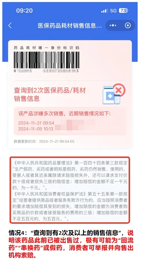 说明该药品此前已被出售过,极有可能为“回流药”“串换药”或假药,消费者可举报并向售出机构索赔。