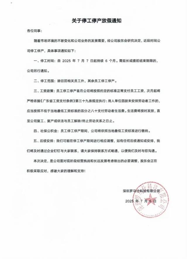 一名罗马仕内部人士向记者提供的一份停工停产放假通知显示,通知日期为7月6日,落款为深圳罗马仕科技有限公司。通知称,随着市场环境的不断变化和公司业务的发展需要,经公司股东会研究决定,近段时间公司停工停产。停工时间自7月7日起,持续6个月;需延长或提前结束期限的,公司另行通知;除召回相关员工外,其余员工停工停产。