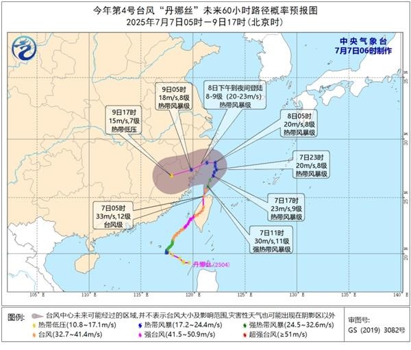 今年第4号台风“丹娜丝”已于今天凌晨0点前后在台湾嘉义县沿海登陆,登陆时由强台风级减弱为台风。预计它将向北偏东方向移动,强度逐渐减弱;8日早晨起转向西偏南方向移动,逐渐向浙江台州至福建福州一带沿海靠近,并于8日下午到夜间在上述沿海登陆。