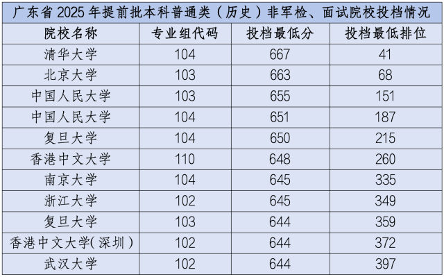 今年,清华大学、北京大学继续领跑,在广东的提前批非军检院校投档线排行榜上稳居前二。