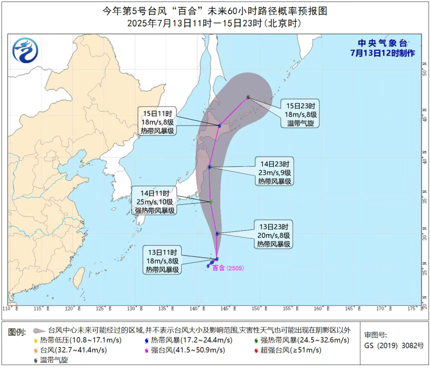 预计,“百合”将以每小时25~30公里的速度向偏北方向移动,强度将有所加强,逐渐向日本东部一带沿海靠近。未来“百合”对我国无影响。
