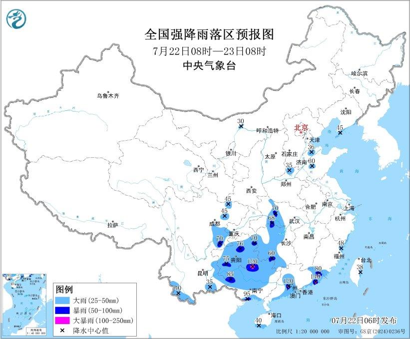 降水预报:7月22日08时至23日08时,海南岛南部、广东中南部、香港、澳门、福建东南部、台湾岛东部、广西大部、云南东部和南部、贵州、湖南中西部、湖北西部、重庆南部以及四川盆地中部和南部等地的部分地区有大到暴雨,其中,广东南部、广西北部、贵州南部等地的局部地区有大暴雨(100~140毫米)。