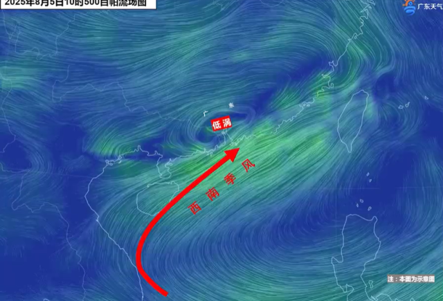 而水汽条件来自季风。目前,强盛的西南季风携带着海上的大量暖湿气流进入广东,各地水汽充沛。