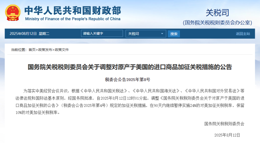 为落实中美经贸会谈共识,根据《中华人民共和国关税法》、《中华人民共和国海关法》、《中华人民共和国对外贸易法》等法律法规和国际法基本原则,经国务院批准,自2025年8月12日12时01分起,调整《国务院关税税则委员会关于对原产于美国的进口商品加征关税的公告》(税委会公告2025年第4号)规定的加征关税措施,在90天内继续暂停实施24%的对美加征关税税率,保留10%的对美加征关税税率。