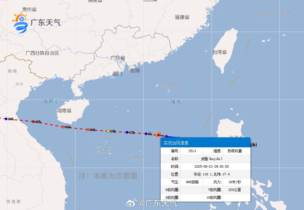 据@广东天气 消息,今年第13号台风“剑鱼”(热带风暴级;英文名称:Kajiki;名字来源:日本;名称意义:剑鱼星座)于23日上午在南海中部偏东海面生成,上午8时其中心位于海南省三亚市偏东方向约770公里的海面上,也就是北纬17.3度、东经116.7度,中心附近最大风力有8级(18米/秒),中心最低气压为998百帕。预计,台风“剑鱼”将以每小时25公里左右的速度继续向西偏北方向移动,逐渐趋向海南岛南部沿海,并将于24日下午到上半夜在上述沿海擦过或登陆,之后趋向越南中北部沿海,25日登陆越南。