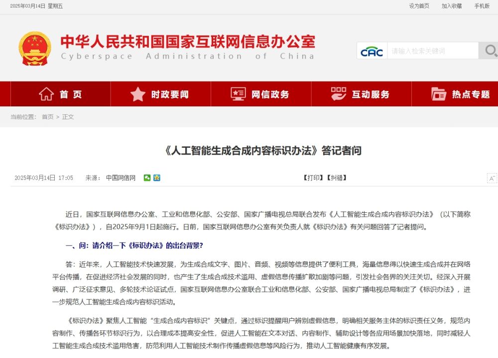 近日,国家互联网信息办公室、工业和信息化部、公安部、国家广播电视总局联合发布《人工智能生成合成内容标识办法》(以下简称《标识办法》),自2025年9月1日起施行。日前,国家互联网信息办公室有关负责人就《标识办法》有关问题回答了记者提问。