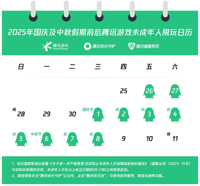 腾讯游戏发布关于国庆及中秋假期前后未成年人游戏限玩的通知,结合国家新闻出版署《关于进一步严格管理 切实防止未成年人沉迷网络游戏的通知》(国新出发〔2021〕14号)与实际放假调休安排,2025年国庆及中秋假期前后,腾讯游戏旗下在中国大陆地区运营的网络游戏面向未成年人的游戏限玩执行如下: