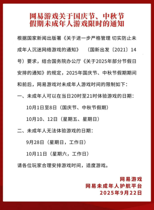 网易游戏发布《网易游戏关于国庆节、中秋节假期未成年人游戏限时的通知》。