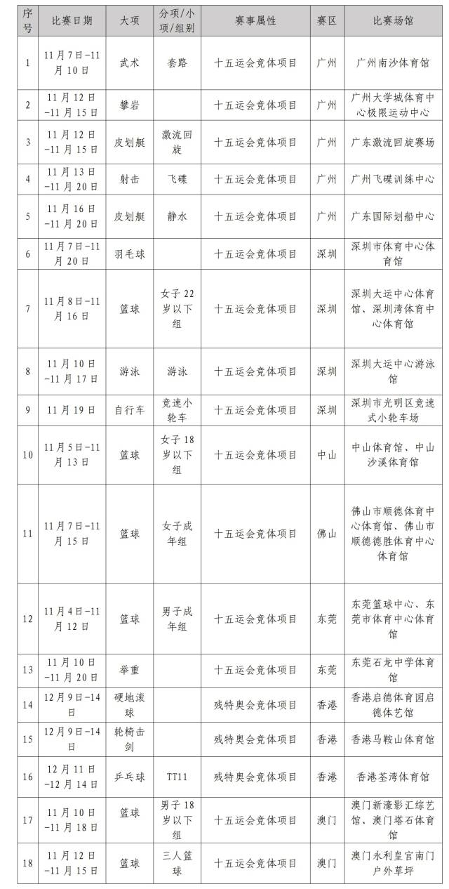 本次第三批售票涵盖18个体育项目,兼顾竞技性与群众关注度。其中广东赛区13个项目,包括十五运会羽毛球、篮球(男子成年组、女子成年组、女子22岁以下组、女子18岁以下组)、武术(套路)、游泳、举重、自行车(竞速小轮车)、皮划艇(静水、激流回旋)、攀岩和射击(飞碟)项目,分布在广州、深圳、中山、佛山和东莞5个城市。